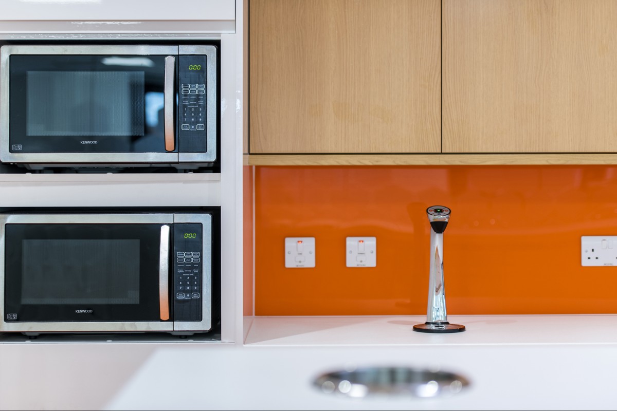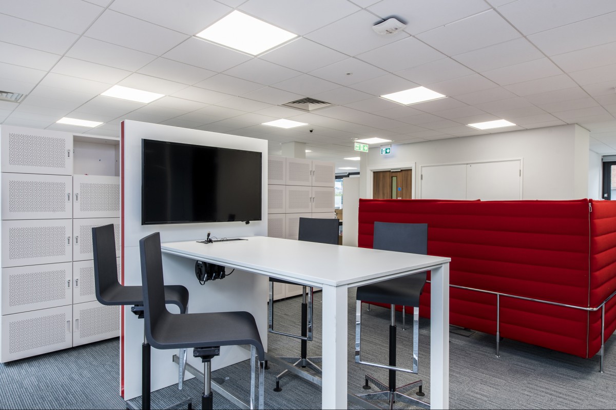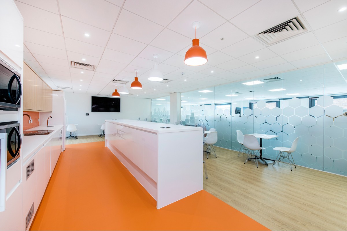 A 150mm2 CAT B Fit Out completed in 10 weeks with a striking orange themed social zone which the client was delighted with. Working closely with our Fabric designer & M&E consultant, we managed to achieve a social zone which was elegant but practical and designed with the lighting highlighting the feature areas.